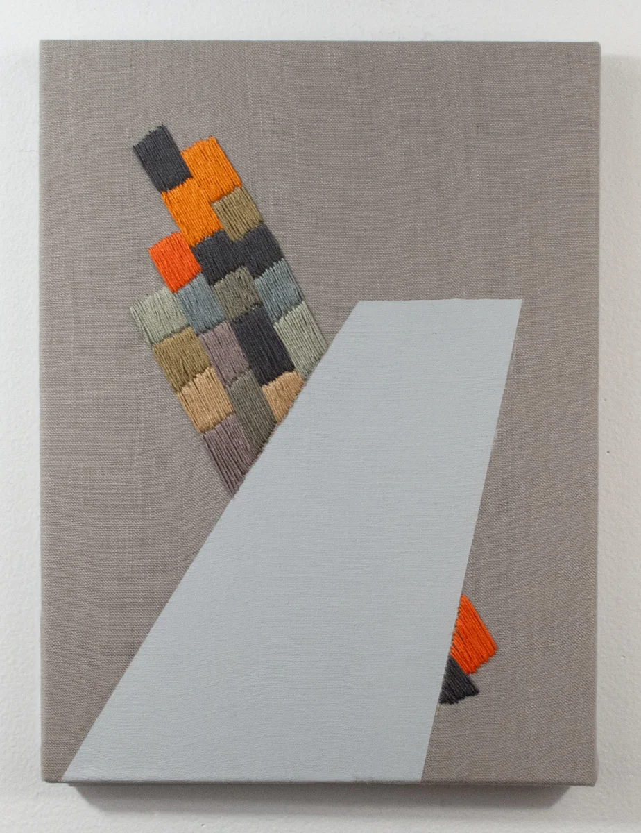 2014, acrylic and hand-embroidered linen on panel, 14" x 11"